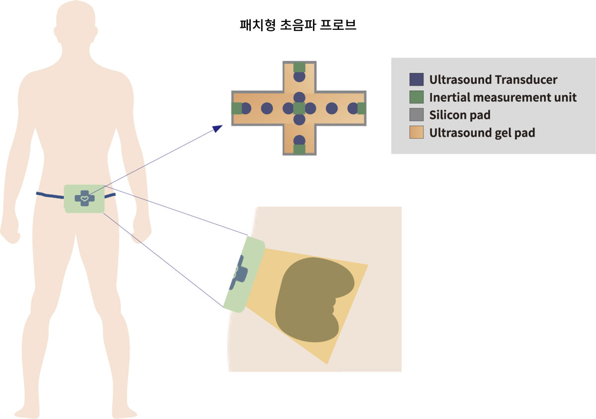 초음파 변환자 배열 십자형태의 Flexible 패드에 초음파 변환자를 최적화 배열을 통해 방광의 잔뇨량 부피를 측정합니다.